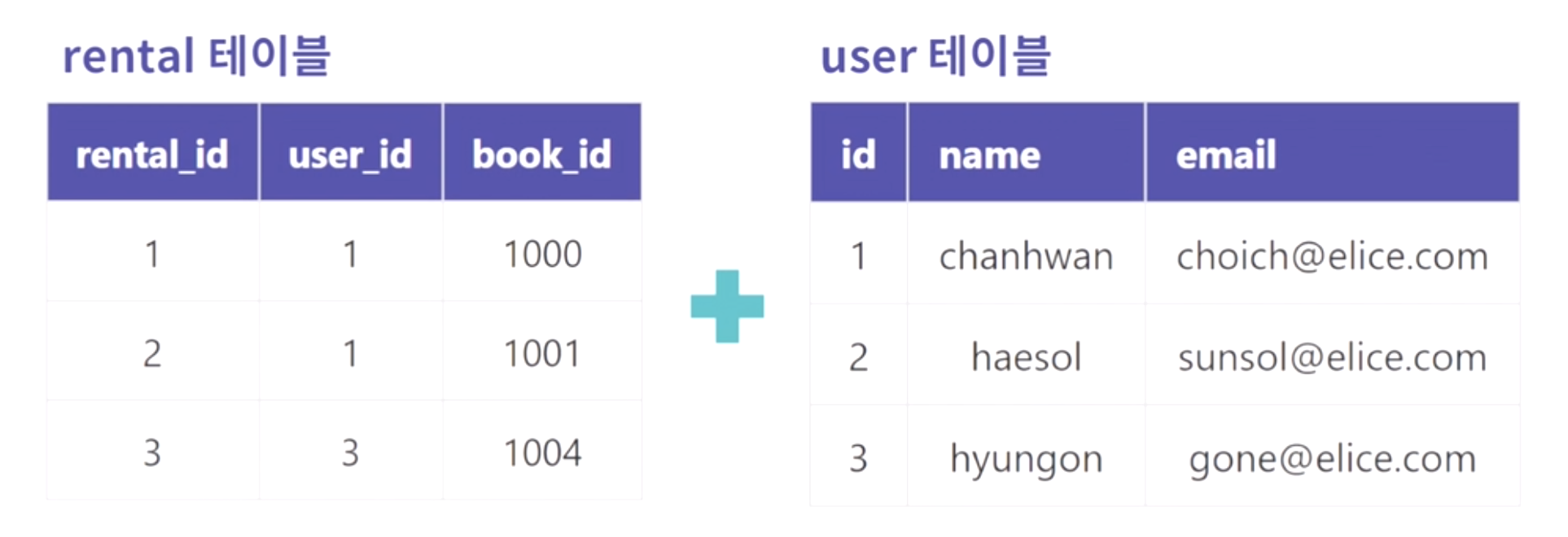 # user table의 id 컬럼과 rental 테이블의 user_id 컬럼이 같다면 연결