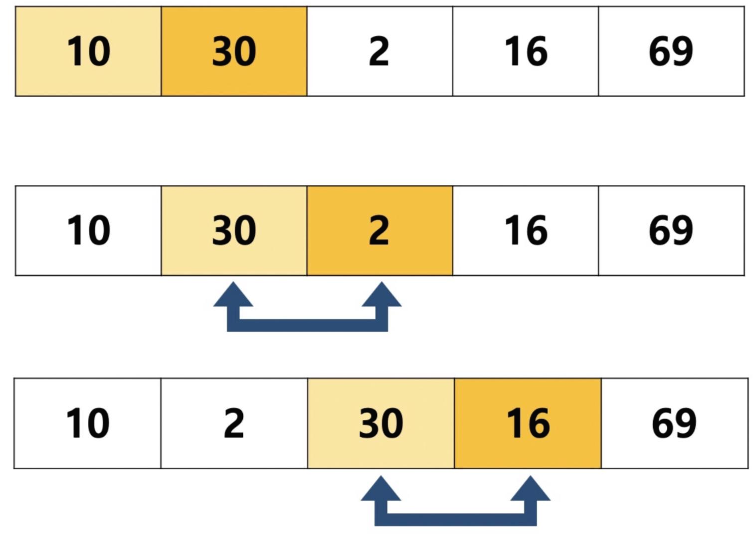 - 첫 번째 원소부터 마지막 원소까지 반복하여 한 단계가 끝나면 가장 큰 원소가 마지막 자리로 정렬됨