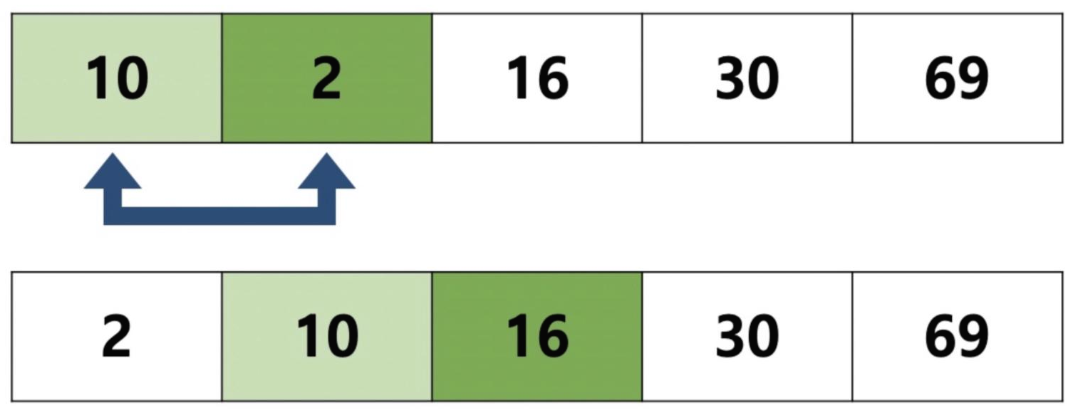- 인접한 두 개의 원소를 비교하여 자리를 교환하는 방식