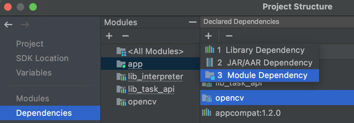 Dependencies ➡️ app ➡️ Declared Dependencies 바로 아래 + 버튼 ➡️ 3 Module Dependency 를 차례대로 선택한다